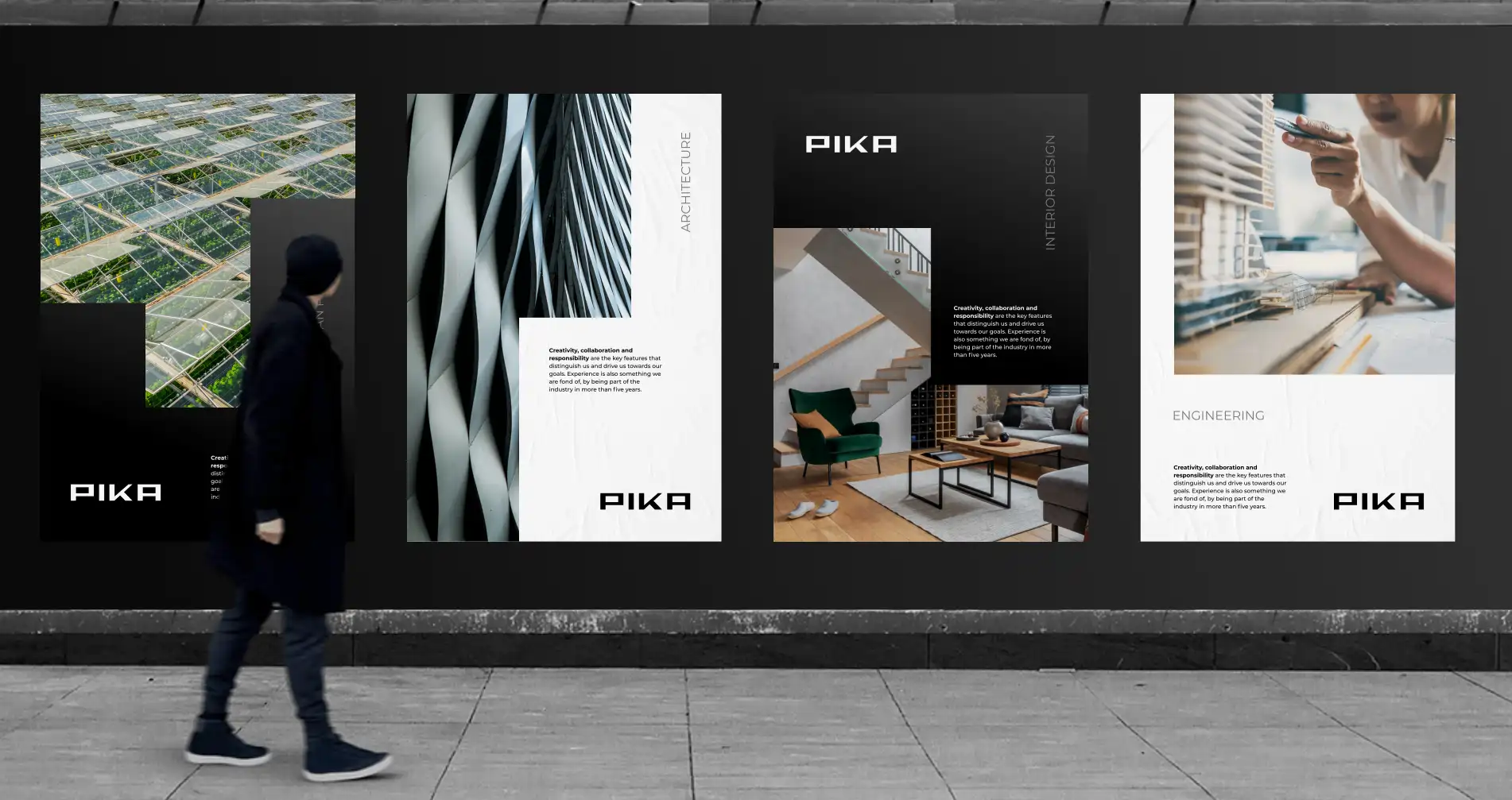 Unitic has artfully translated PIKA’s six distinct disciplines—Residential, Commercial, Industrial, Public, Interior, and Supervision—into a cohesive visual language.